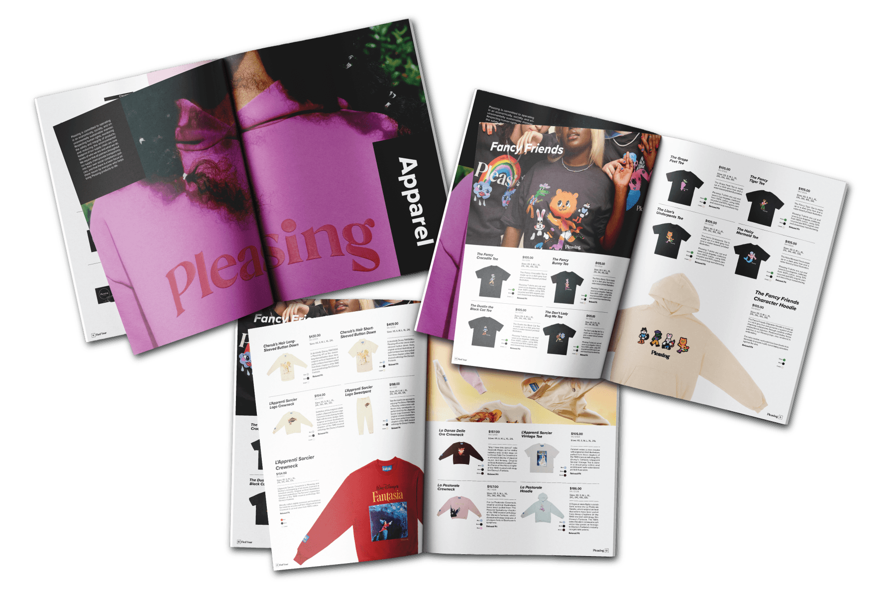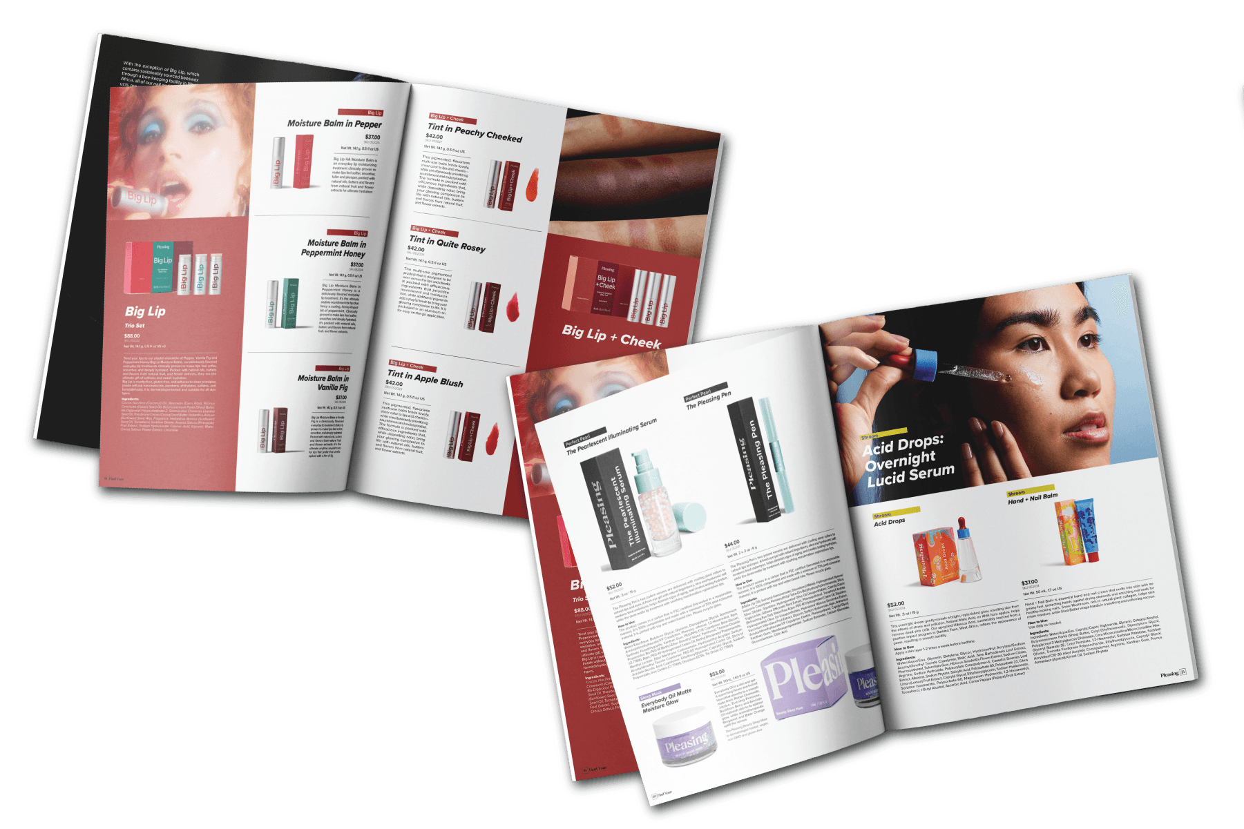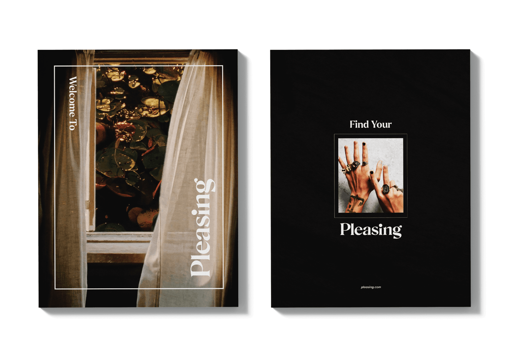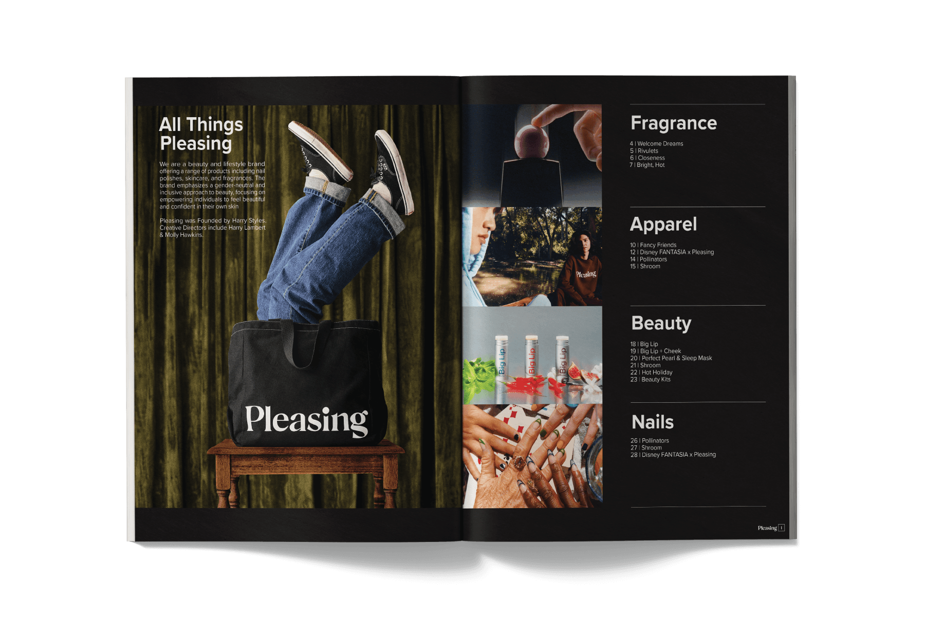 This catalogue design uses products and research from the brand 'Pleasing' by Harry Styles. The overall outcome was inspired by the branding structure and visual on their website and social media platforms.