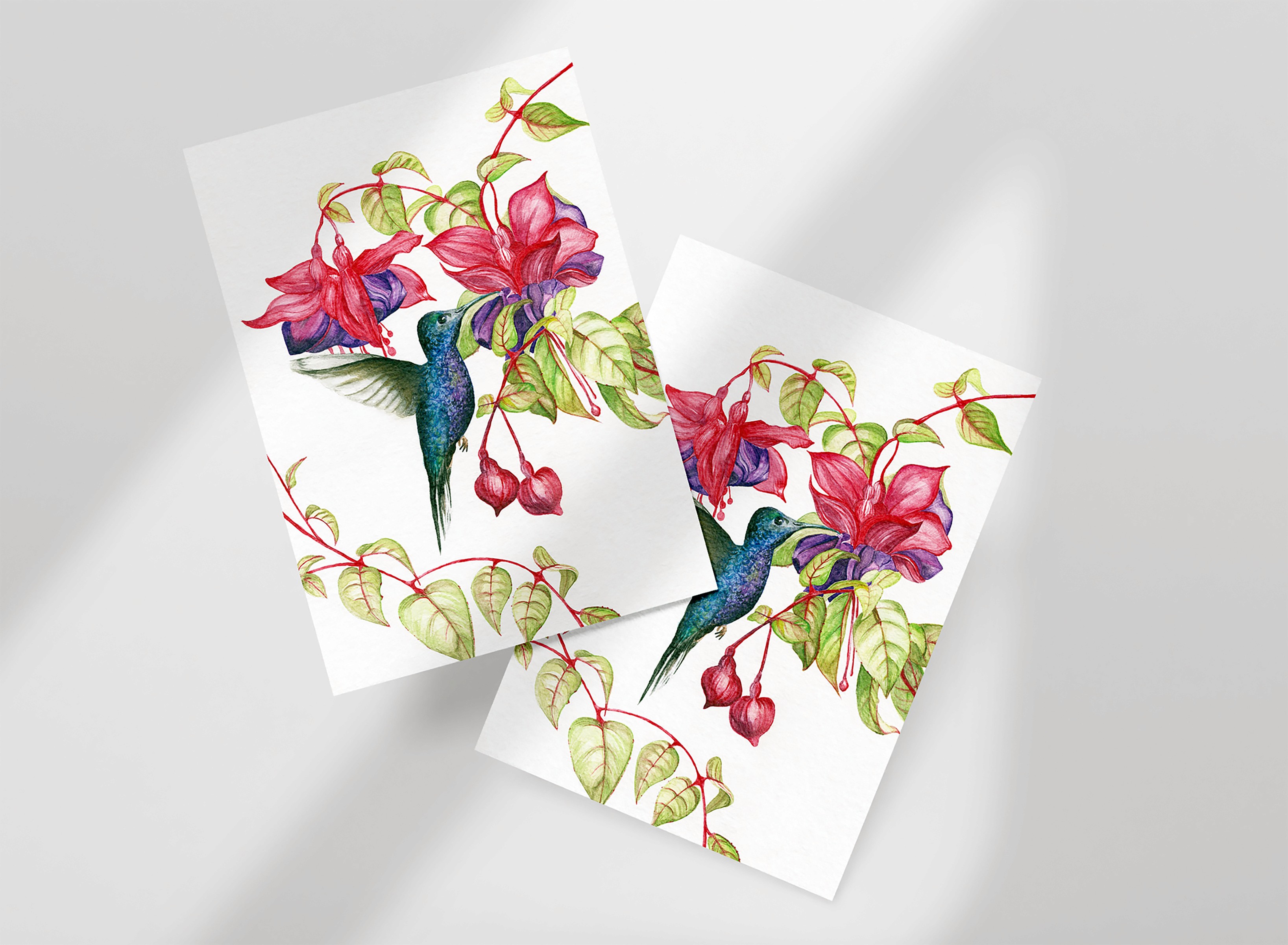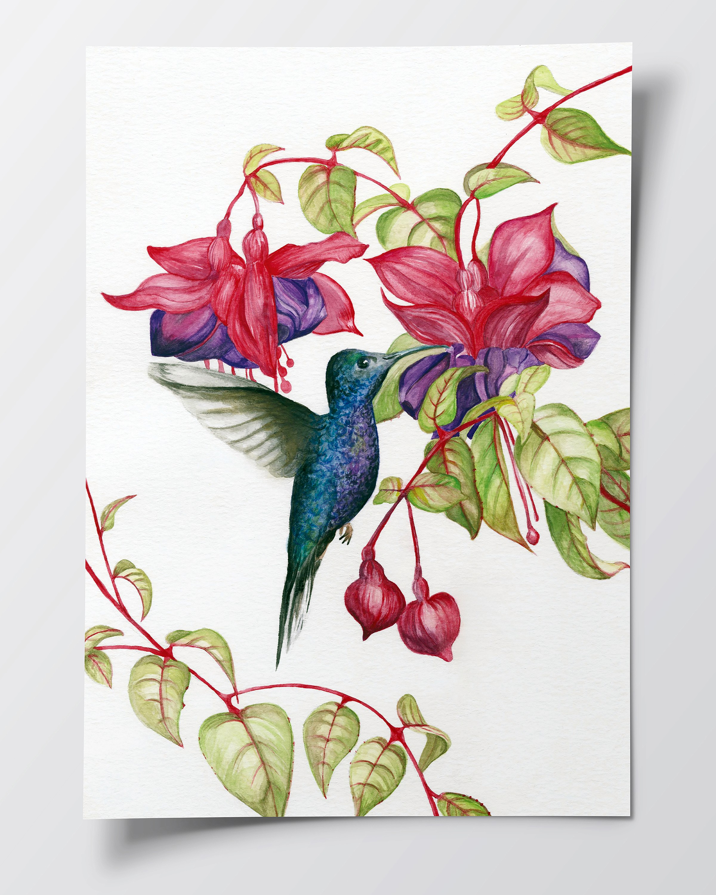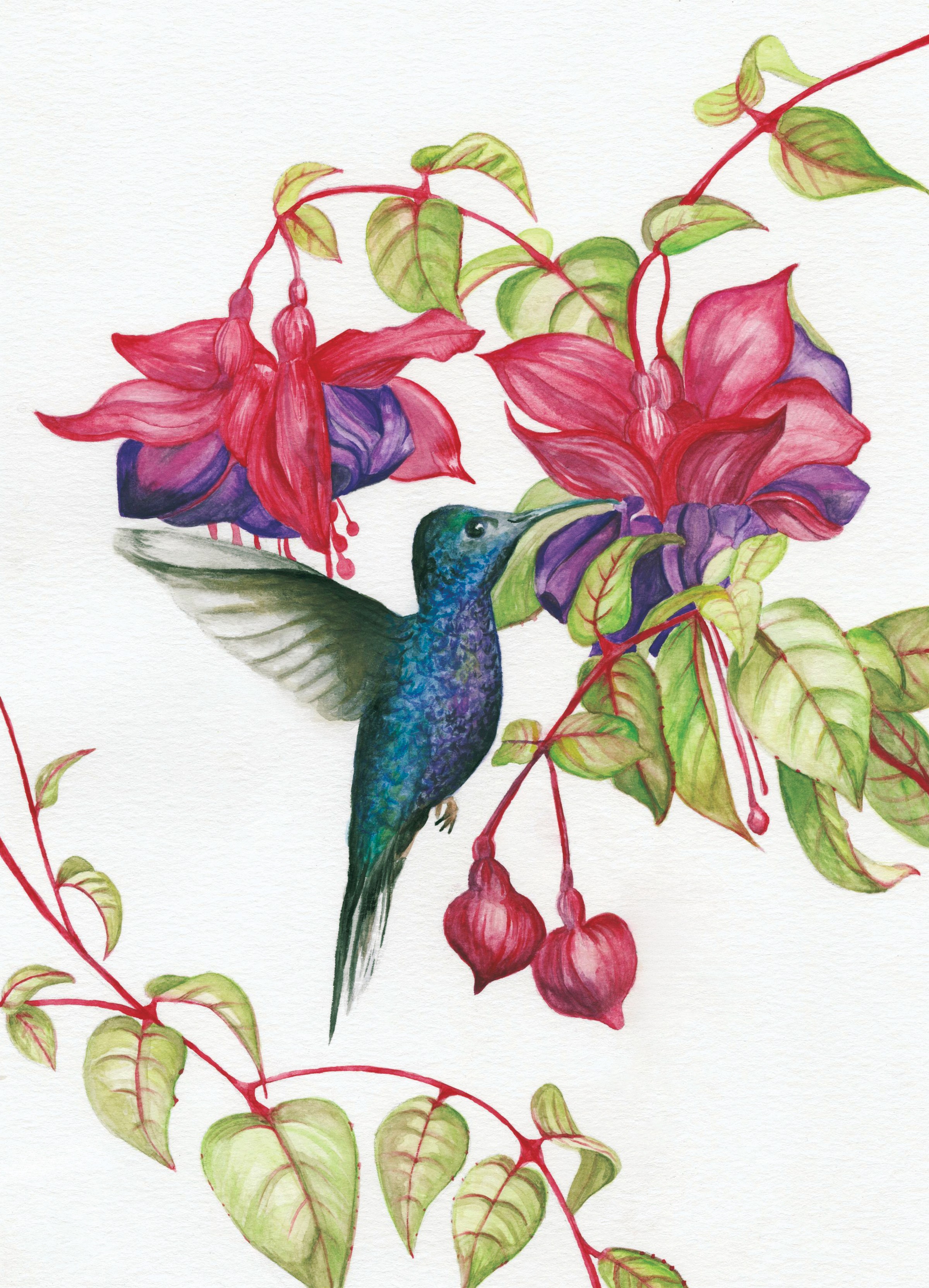 This piece was an illustration project based on working with watercolour as the art medium. Creating a nature illustration, I choose to paint a hummingbird with Fuchsia flowers.