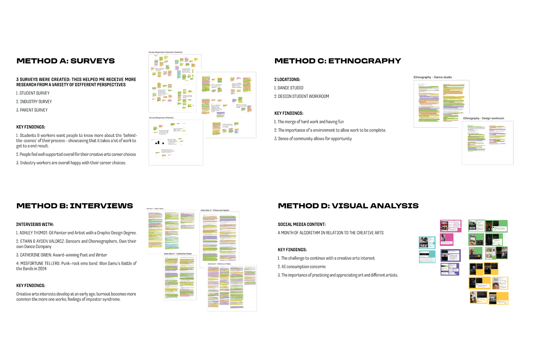 Three surveys (Students, Industry workers, and Parents), four interviews with artists from different fields, two ethnographies (dance studio, and design workroom), and a visual analysis through social media.