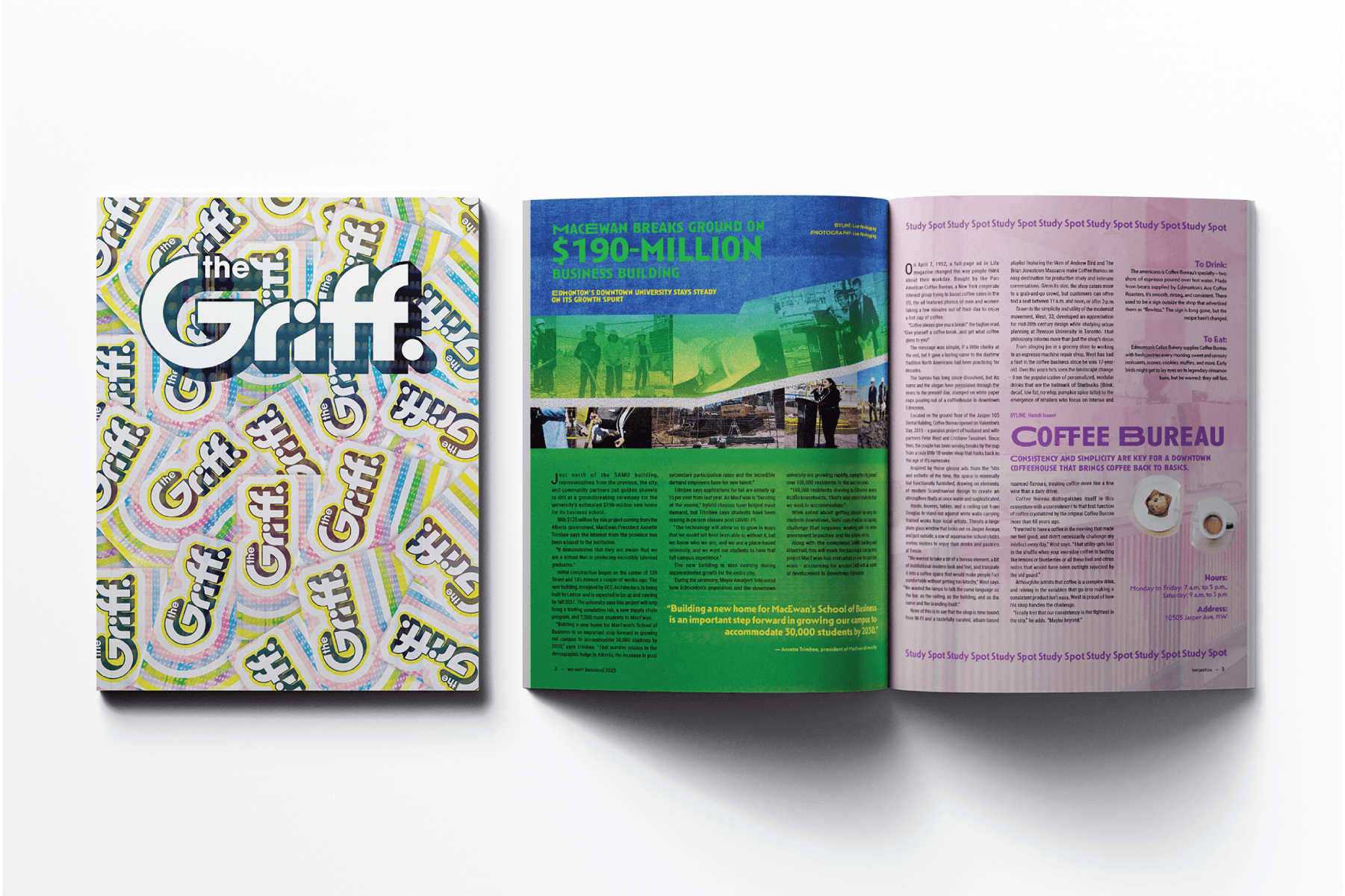 In class, we met with the Griff Magazine team to re-design their monthly magazine as if we were the current designers on the team. One of the most essential parts they valued was that we designed the magazine to represent our personality and display what would make us more intrigued to read the magazine, as well as other students at MacEwan University.